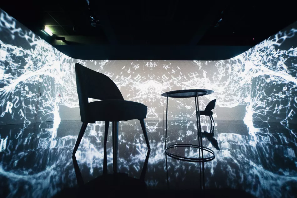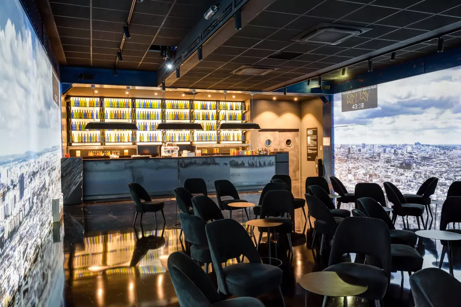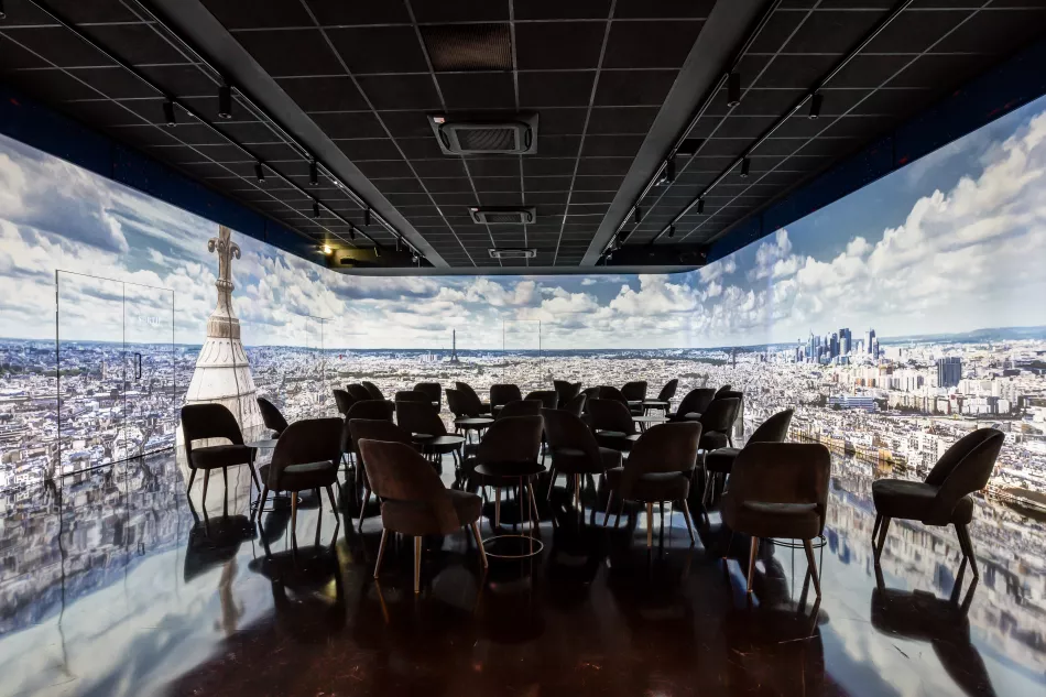 18h30-19h : Coupe de champagne (et feuilletés salés) servi dans le studio avec projection immersive en fond (ambiance animée Toits de Paris)